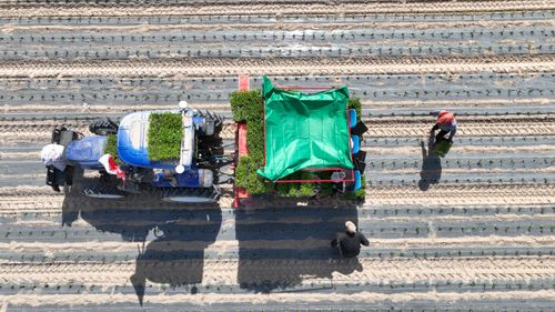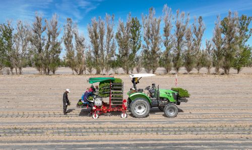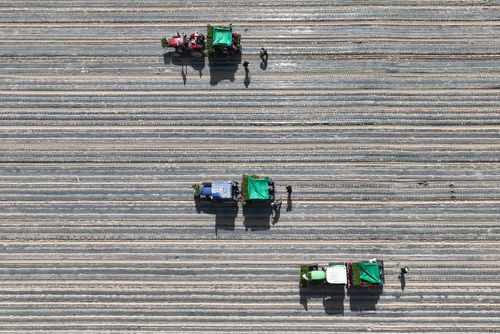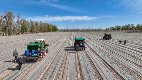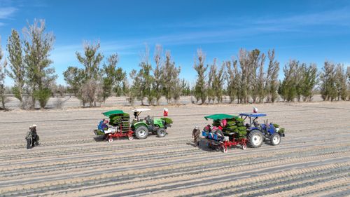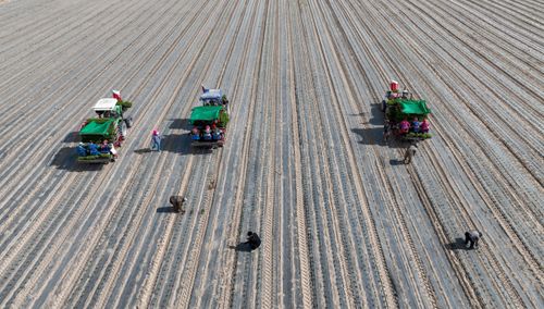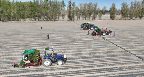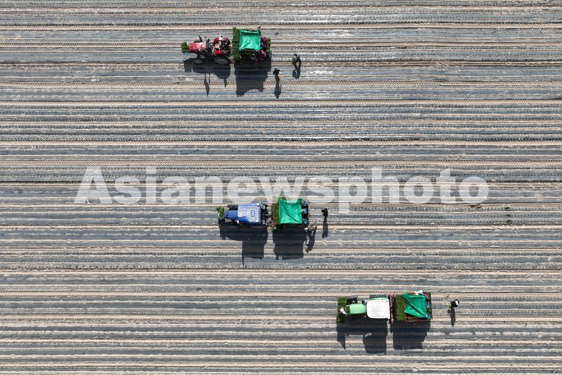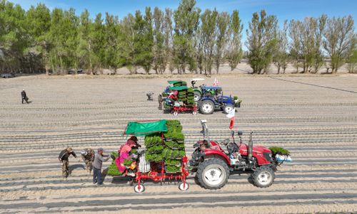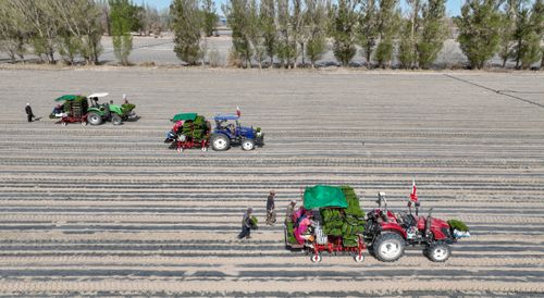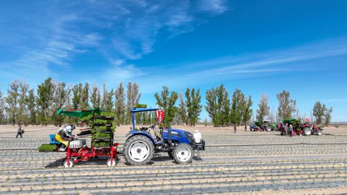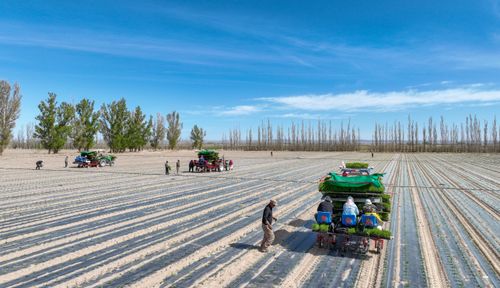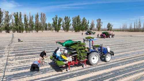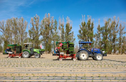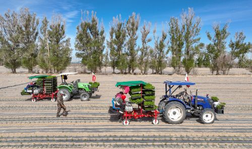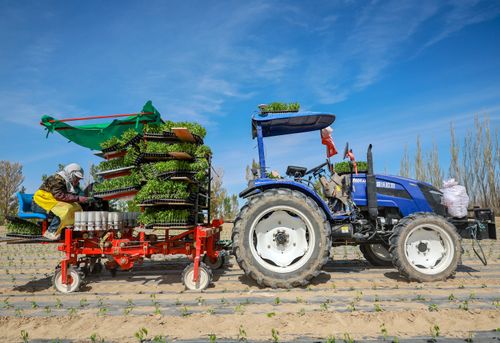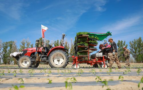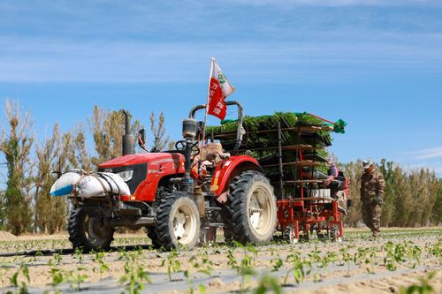 2025年4月23日,甘肃农垦亚盛金塔分公司的辣椒种植基地,工人利用装有北斗卫星导航系统的辣椒移栽机在田间有序作业。