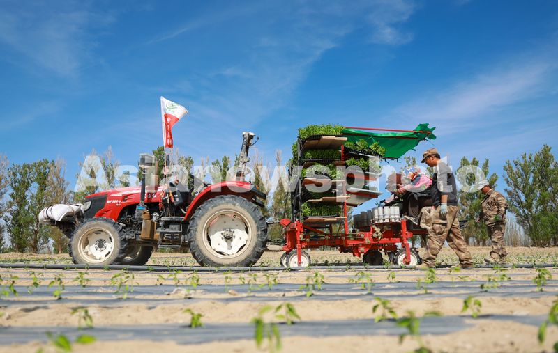 2025年4月23日,甘肃农垦亚盛金塔分公司的辣椒种植基地,工人利用装有北斗卫星导航系统的辣椒移栽机在田间有序作业。