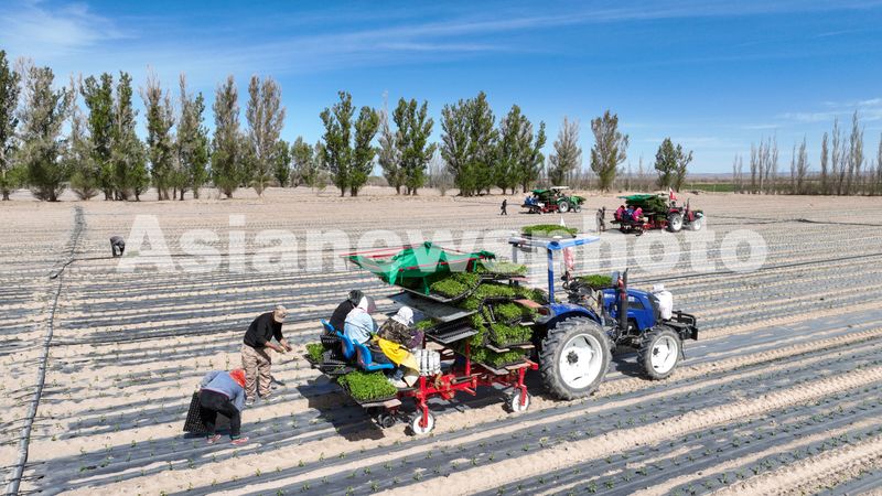 2025年4月23日,甘肃农垦亚盛金塔分公司的辣椒种植基地,工人利用装有北斗卫星导航系统的辣椒移栽机在田间有序作业。