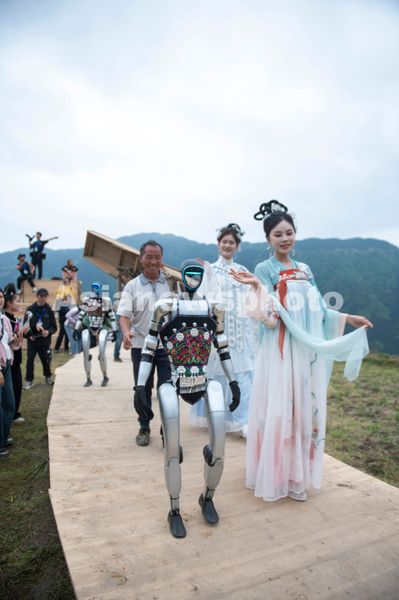 图片说明:2025年4月26日,汉服爱好者与机器人在贵州省从江县加榜梯田上参加梯田走秀活动。