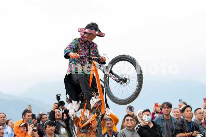图片说明:2025年4月26日,表演者在贵州省从江县加榜梯田的梯田走秀活动上展示车技。