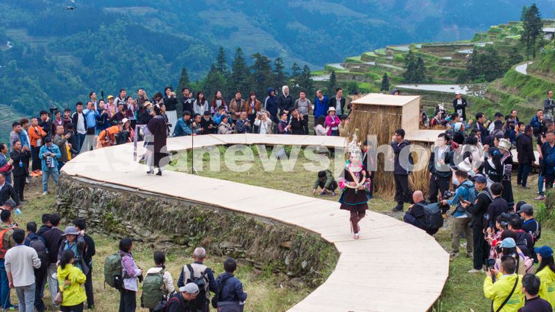 图片说明:2025年4月26日,村民在贵州省从江县加榜梯田上参加梯田走秀活动。