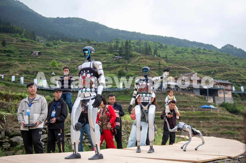 图片说明:2025年4月26日,机器人在贵州省从江县加榜梯田上参加梯田走秀活动。