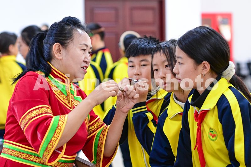 2025年4月28日,民间艺人郭曙红(左)在研学活动中讲解口弦琴演奏技巧。