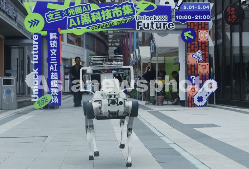 2025年5月4日,云深处绝影X30巡检机器狗在杭文三数字生活街区的AI黑科技市集上进行“巡街”。