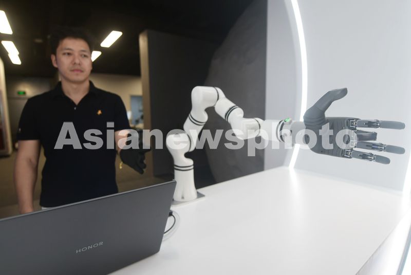 2025年5月4日,强脑科技工作人员在杭州文三数字生活街区的AI黑科技市集上演示脑机接口仿生手。