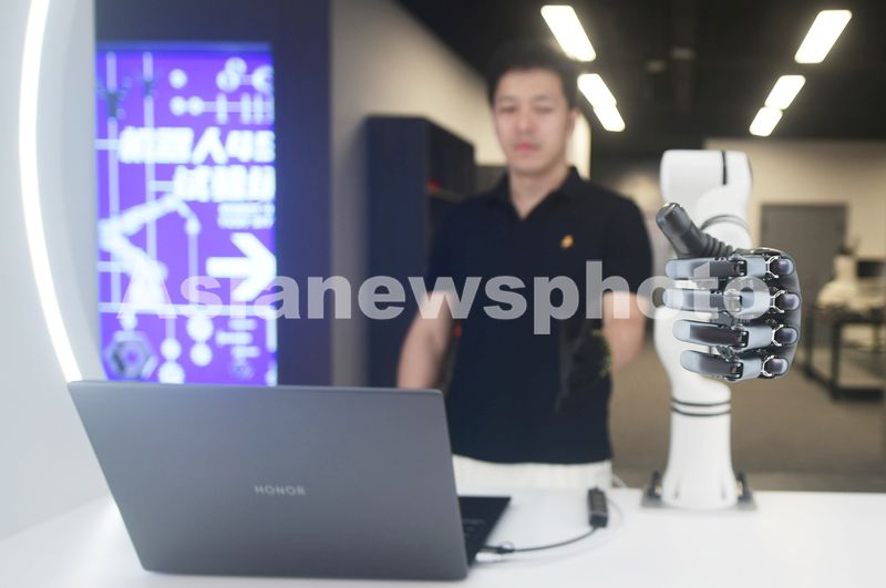 2025年5月4日,强脑科技工作人员在杭州文三数字生活街区的AI黑科技市集上演示脑机接口仿生手。