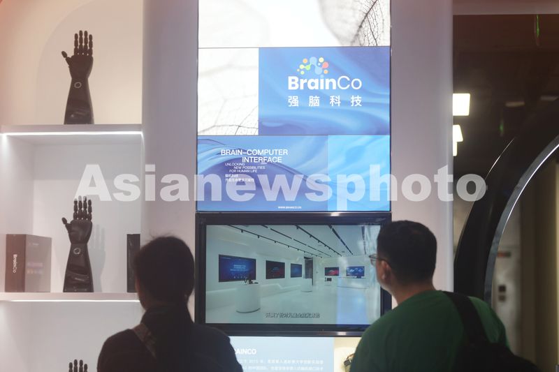 2025年5月4日,市民在杭州文三数字生活街区的AI黑科技市集上观看强脑科技的脑机接口仿生手。