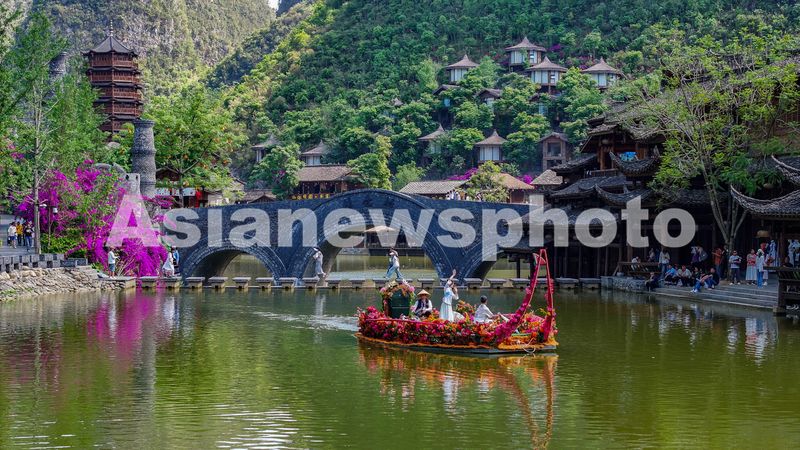 图片说明:5月3日,演员在贵州省黔西南布依族苗族自治州兴义市峰林布依景区水上表演。