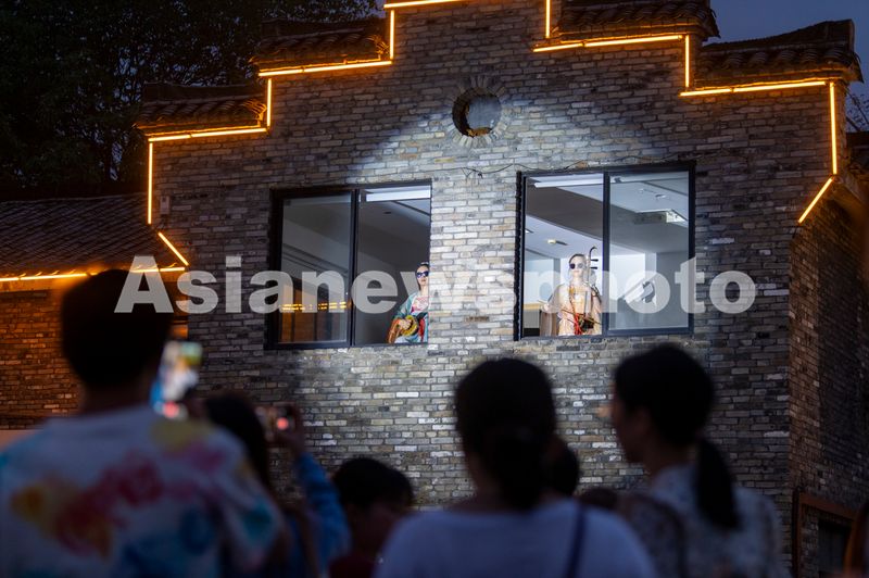 2025年5月4日晚,浙江省金华市婺城区婺州古城景区,文艺工作者在景区里为游客表演节目。
