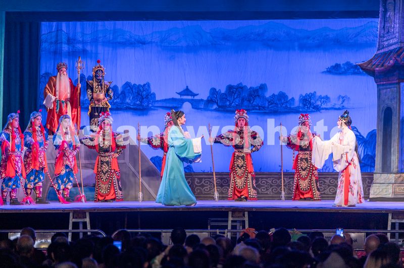 2025年5月4日晚,浙江省金华市婺城区婺州古城景区,游客在欣赏婺剧大戏《青蛇传》。