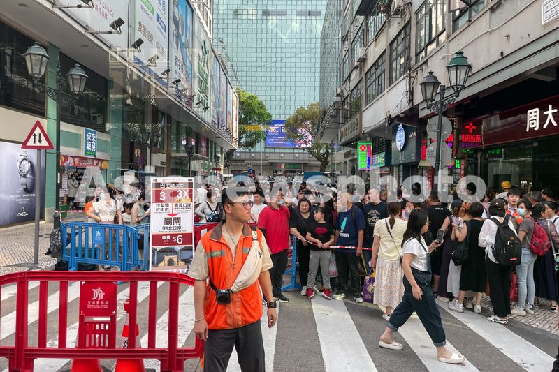 5月2日,澳门,游客等待乘坐前往珠海拱北口岸的巴士。