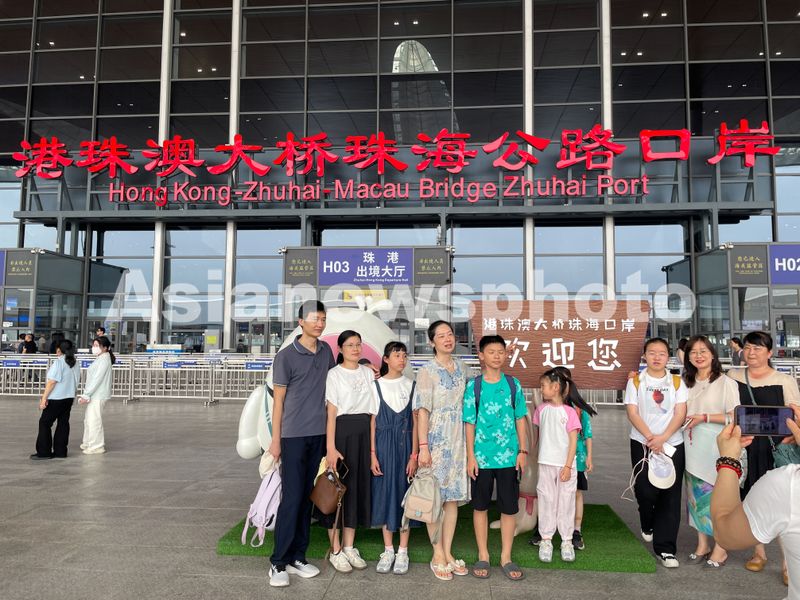 5月3日,港珠澳大桥珠海公路口岸,经港珠澳大桥从珠海前往香港的内地旅客合影留念。