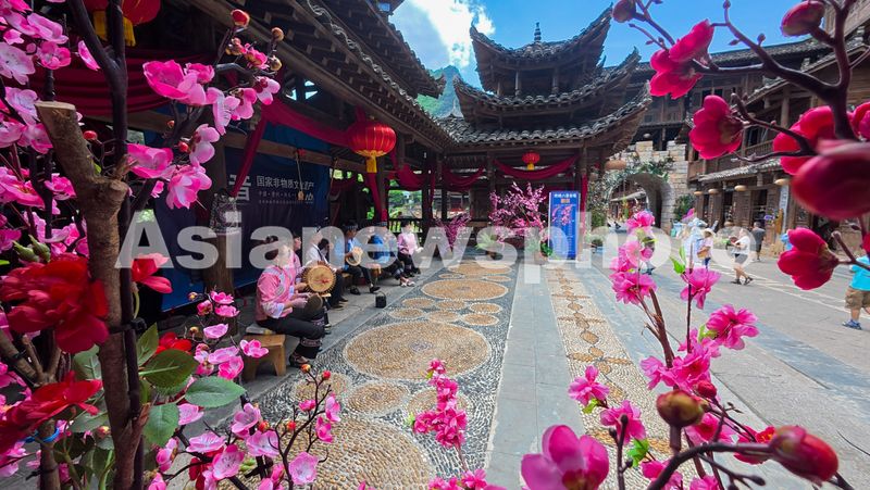 图片说明:5月3日,民间艺人在贵州省黔西南布依族苗族自治州兴义市峰林布依景区表演八音坐唱。