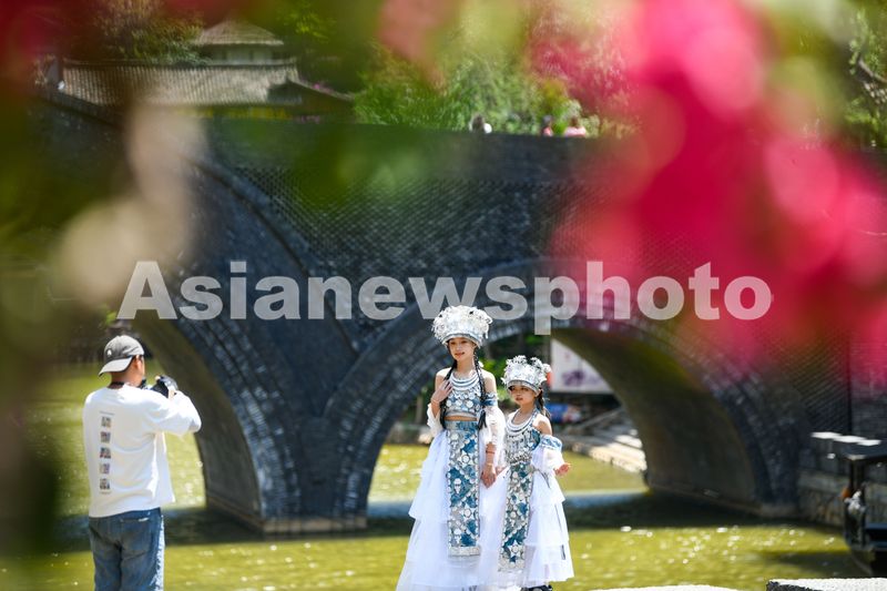图片说明:5月3日,游客在贵州省黔西南布依族苗族自治州兴义市峰林布依景区拍照。