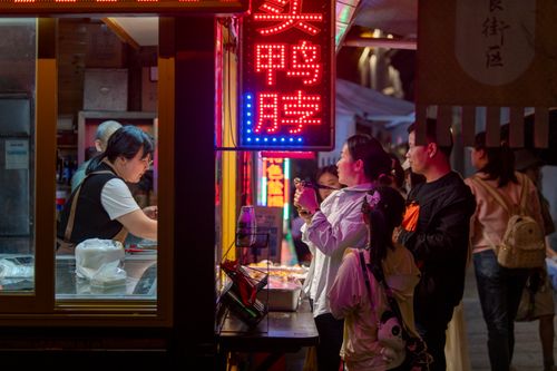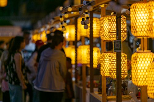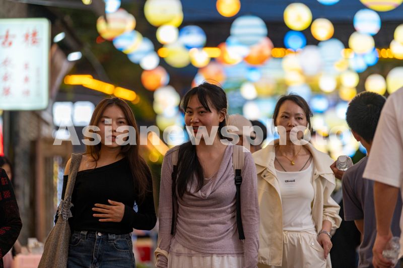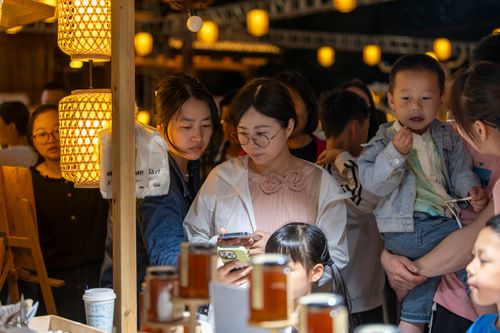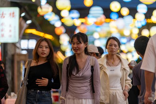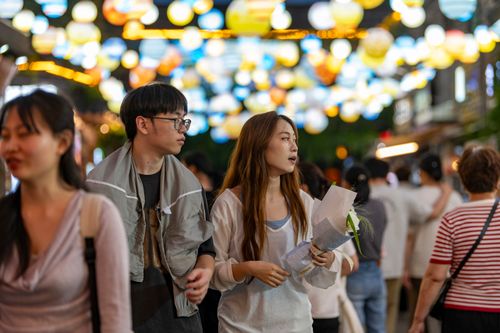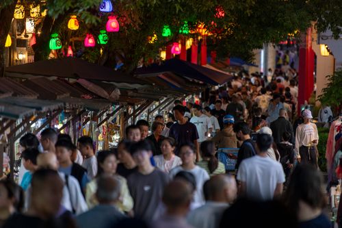 2025年5月4日晚,浙江省金华市婺城区婺州古城景区,游客在非遗市集里休闲度假。