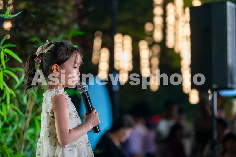 2025年5月4日晚,浙江省金华市婺城区婺州古城景区,小朋友在景区里朗诵古诗,体验古韵文化。