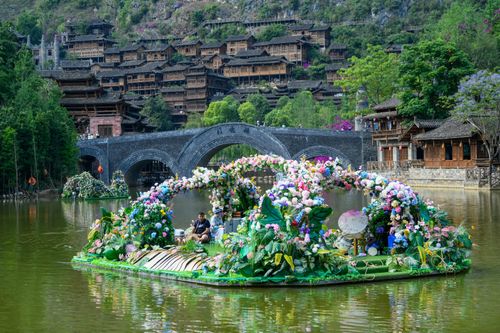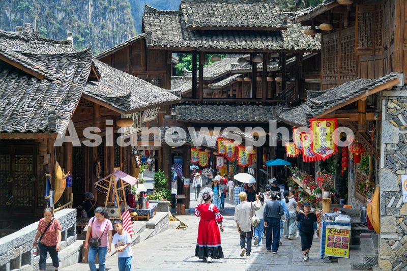 图片说明:5月3日,游客在贵州省黔西南布依族苗族自治州兴义市峰林布依景区游玩。