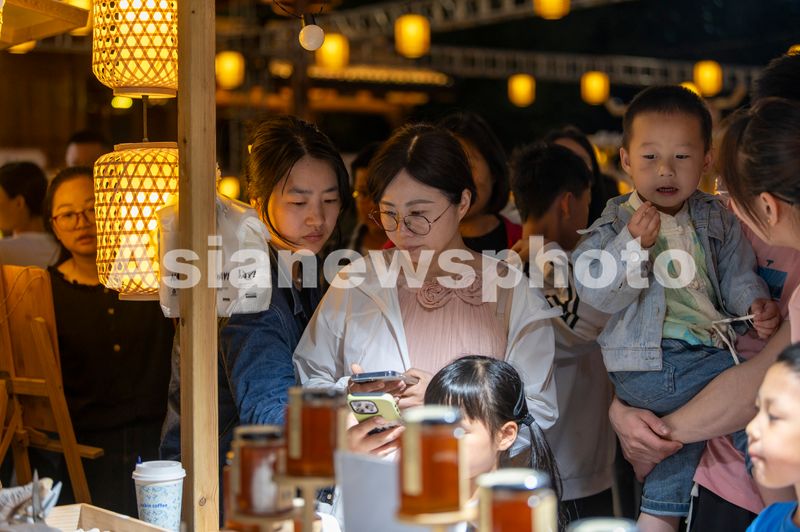 2025年5月4日晚,浙江省金华市婺城区婺州古城景区,游客在非遗市集里休闲度假。