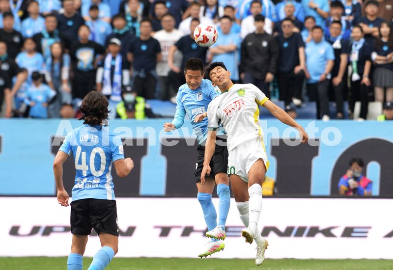 图片说明:2025年5月5日,身着蓝色队服的大连英博海发球员与北京国安球员场上拼抢。