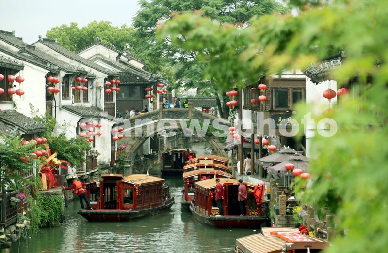 2025年5月5日,众多游客乘船在江苏苏州山塘街水巷游玩。立夏过后,江苏苏州天气炎热,颇具江南水乡特色的古街“水上游”特色旅游项目成为许多中外游客消夏避暑的好选择。