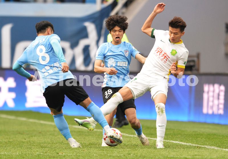 图片说明:2025年5月5日,身着蓝色队服的大连英博海发球员与北京国安球员场上拼抢。