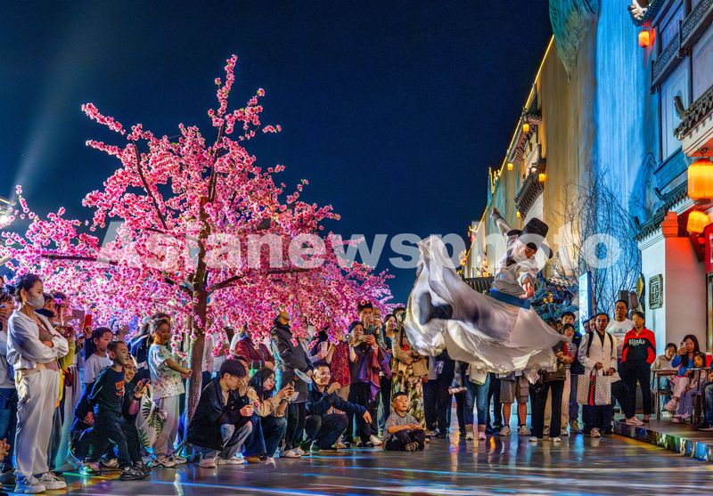 图片说明:2025年5月5日,安徽省马鞍山市长江不夜城旅游休闲街区内,游客们正在观看表演。