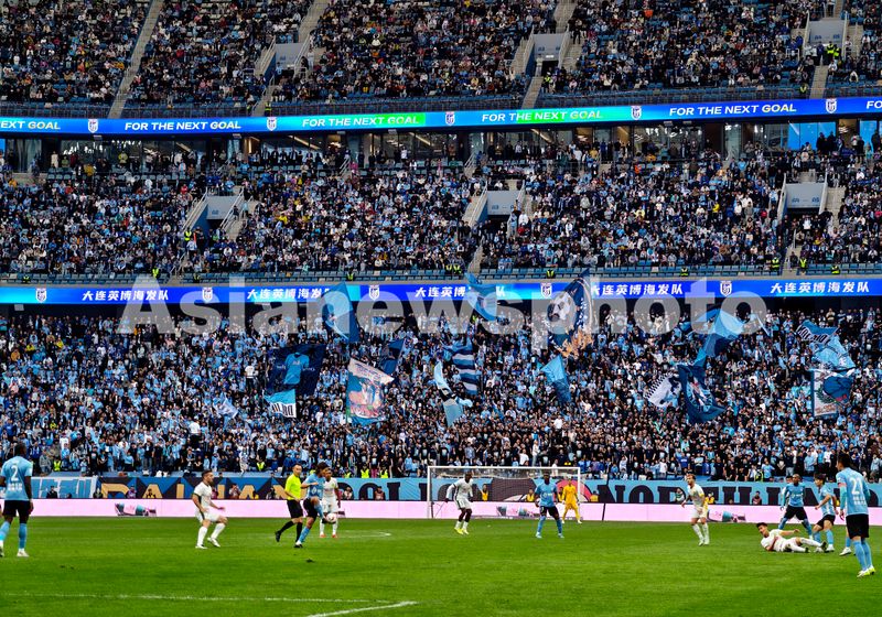 图片说明:2025年5月5日,身着蓝色队服的大连英博海发球员与北京国安球员场上拼抢。