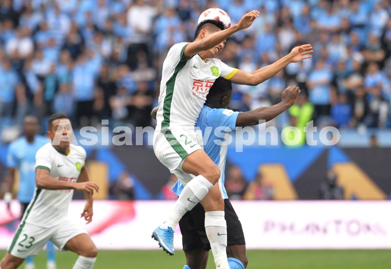 图片说明:2025年5月5日,身着蓝色队服的大连英博海发球员与北京国安球员场上拼抢。