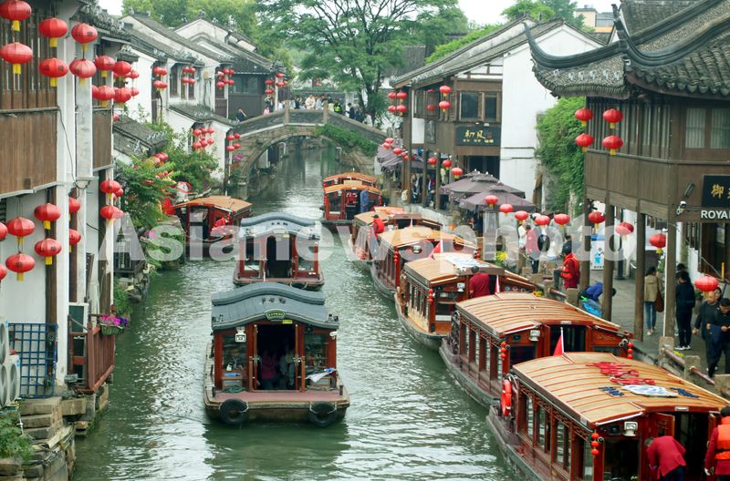2025年5月5日,众多游客乘船在江苏苏州山塘街水巷游玩。
