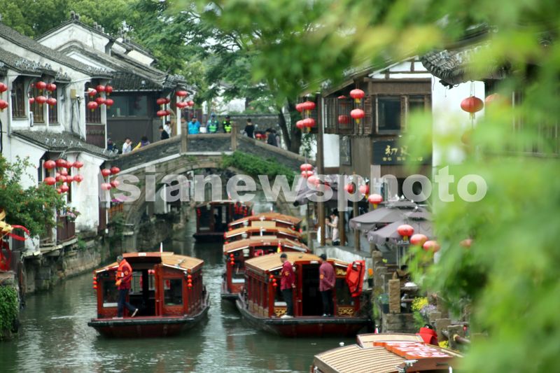 2025年5月5日,众多游客乘船在江苏苏州山塘街水巷游玩。立夏过后,江苏苏州天气炎热,颇具江南水乡特色的古街“水上游”特色旅游项目成为许多中外游客消夏避暑的好选择。