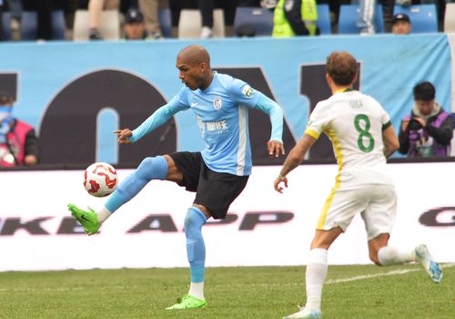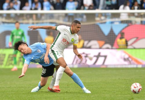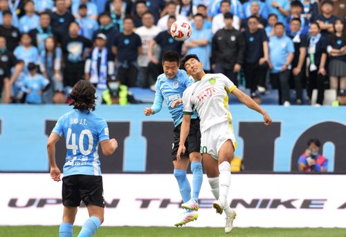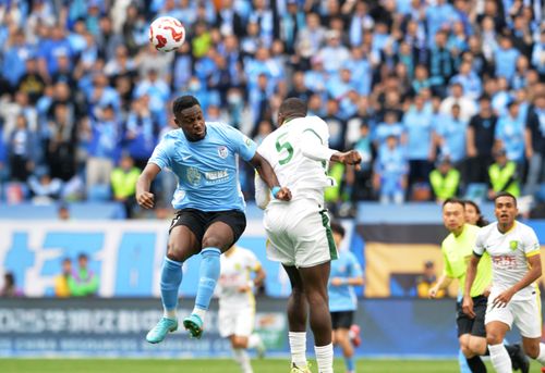 图片说明:2025年5月5日,身着蓝色队服的大连英博海发球员与北京国安球员场上拼抢。