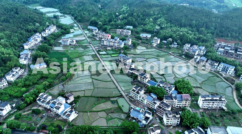 图片说明:2025年5月8日,江西省遂川县枚江镇乡村,错落房舍静卧于葱郁山林怀抱,纵横田埂如大地脉络延展。