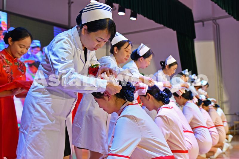 图片说明:2025年5月8日,在山东省烟台护士学校举行的护士节授帽仪式上,护理前辈为学生授帽。