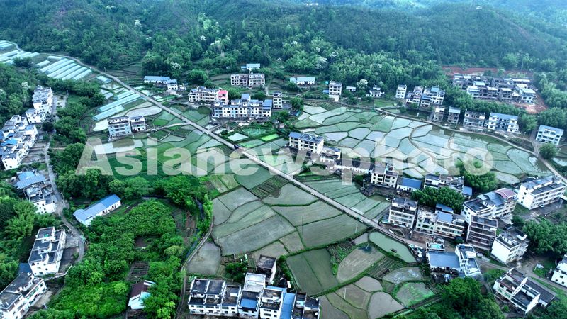 图片说明:2025年5月8日,江西省遂川县枚江镇乡村,错落房舍静卧于葱郁山林怀抱,纵横田埂如大地脉络延展。
