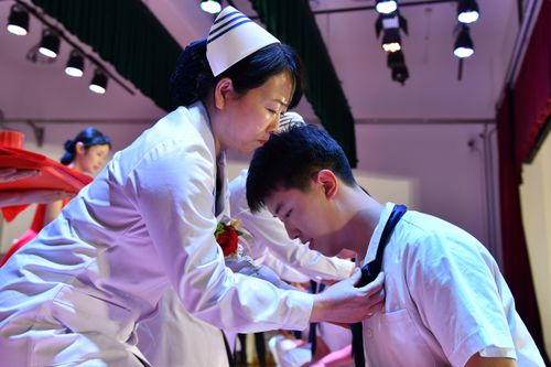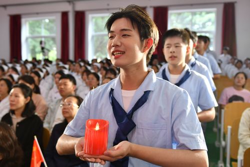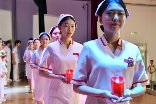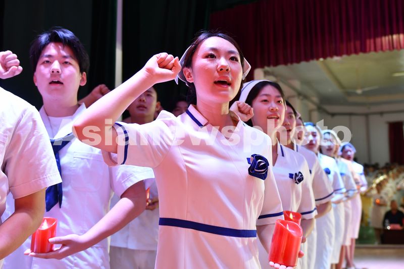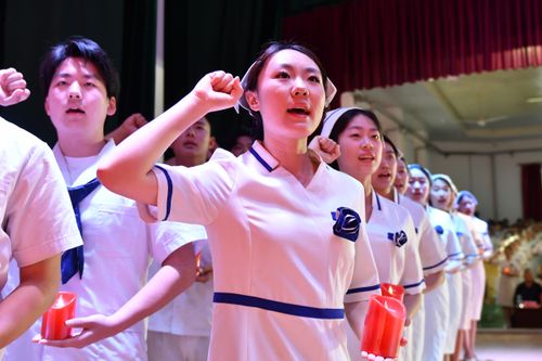 图片说明:2025年5月8日,在山东省烟台护士学校举行的护士节授帽仪式上,学生手托红烛集体宣誓。