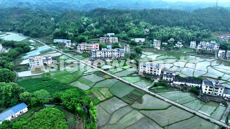 图片说明:2025年5月8日,江西省遂川县枚江镇乡村,错落房舍静卧于葱郁山林怀抱,纵横田埂如大地脉络延展。