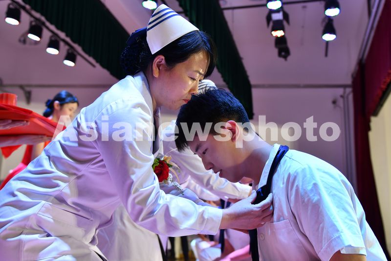 图片说明:2025年5月8日,在山东省烟台护士学校举行的护士节授帽仪式上,护理前辈为学生授丝带。