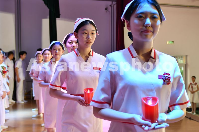 图片说明:2025年5月8日,在山东省烟台护士学校举行的护士节授帽仪式上,学生手捧象征奉献精神的红烛。