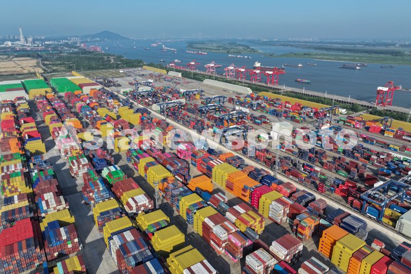 图片说明:2025年5月12日,江苏南京港集装箱码头,车来船往,货轮在泊位上有序装卸集装箱,一派繁忙景象。