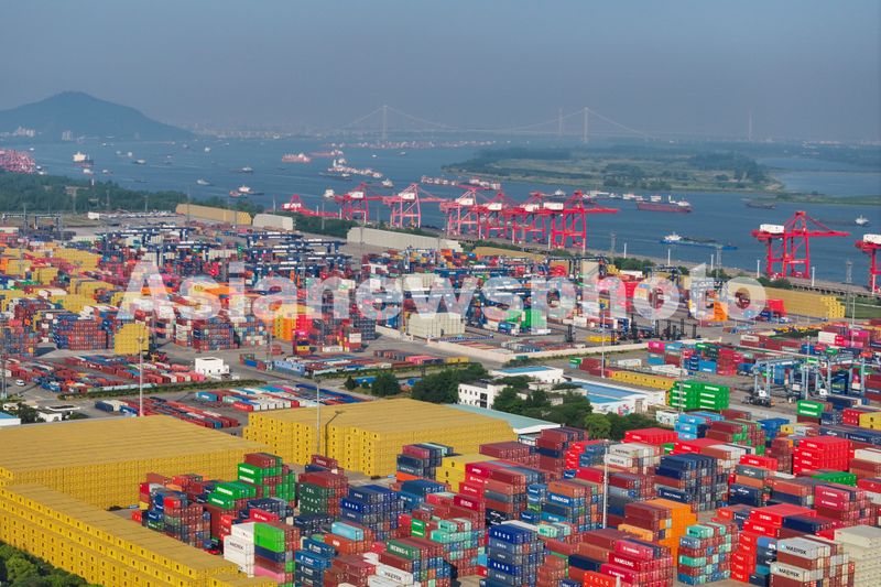 2025年5月12日,江苏南京港集装箱码头,车来船往,货轮在泊位上有序装卸集装箱,一派繁忙景象。