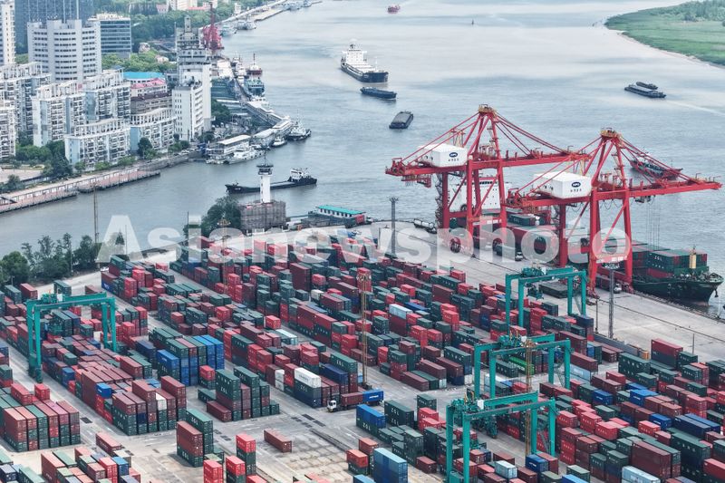 2025年5月11日,货轮停泊在上海港张华浜集装箱码头上有序装卸外贸集装箱,卡车在堆场往来穿梭,一派繁忙景象。
