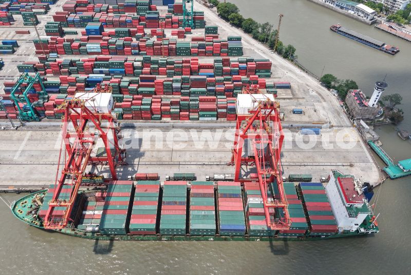 5月11日,货轮停泊在上海港张华浜集装箱码头上有序装卸外贸集装箱,卡车在堆场往来穿梭,一派繁忙景象。