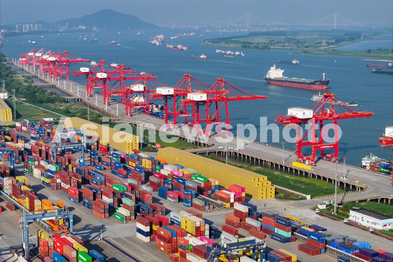 图片说明:2025年5月12日,江苏南京港集装箱码头,车来船往,货轮在泊位上有序装卸集装箱,一派繁忙景象。