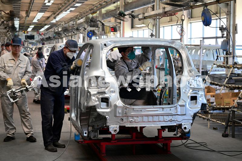 2025年5月13日,浙江省金华市新能源汽车小镇零跑汽车智能工厂车间里,工人们正在新能源汽车自动化生产线上装配零部件。