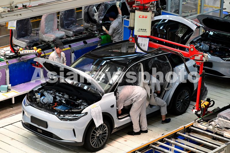 2025年5月13日,浙江省金华市新能源汽车小镇零跑汽车智能工厂车间里,工人们正在新能源汽车自动化生产线上装配零部件。