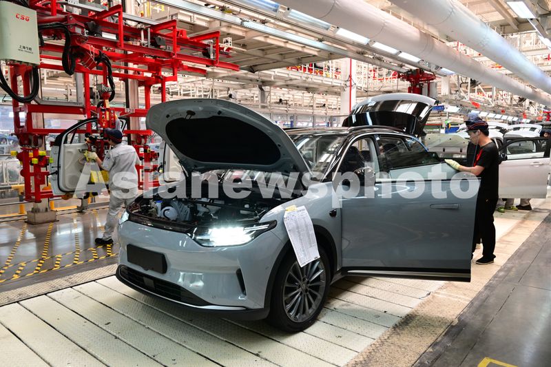 2025年5月13日,浙江省金华市新能源汽车小镇零跑汽车智能工厂车间里,工人们正在新能源汽车自动化生产线上装配零部件。