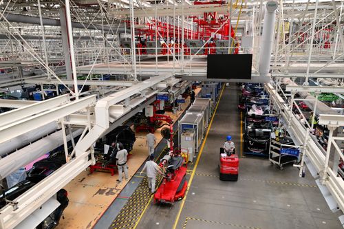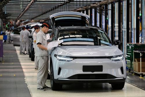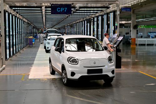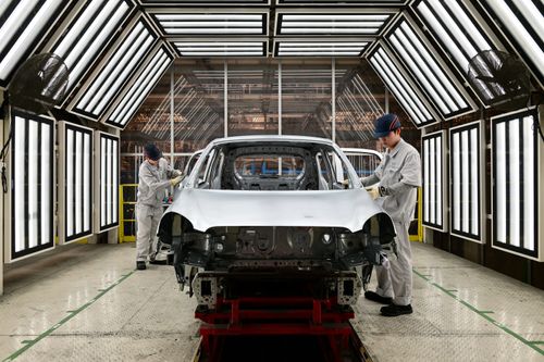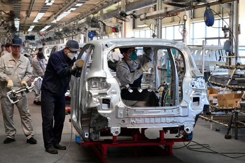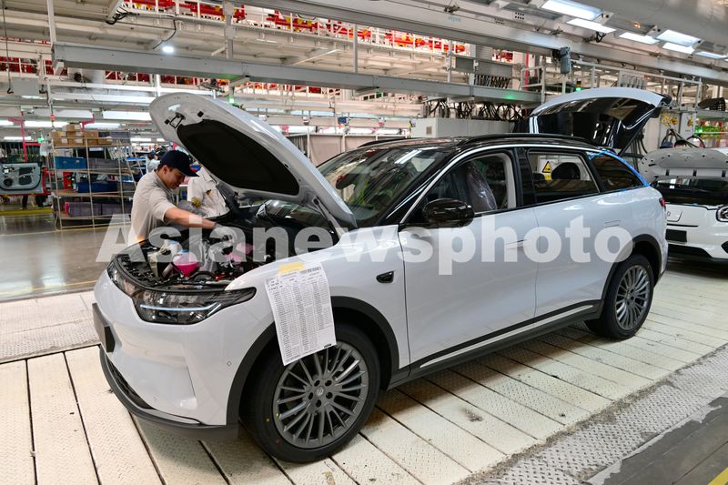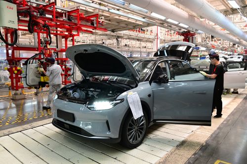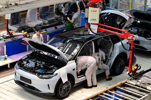 2025年5月13日,浙江省金华市新能源汽车小镇零跑汽车智能工厂车间里,工人们正在新能源汽车自动化生产线上装配零部件。