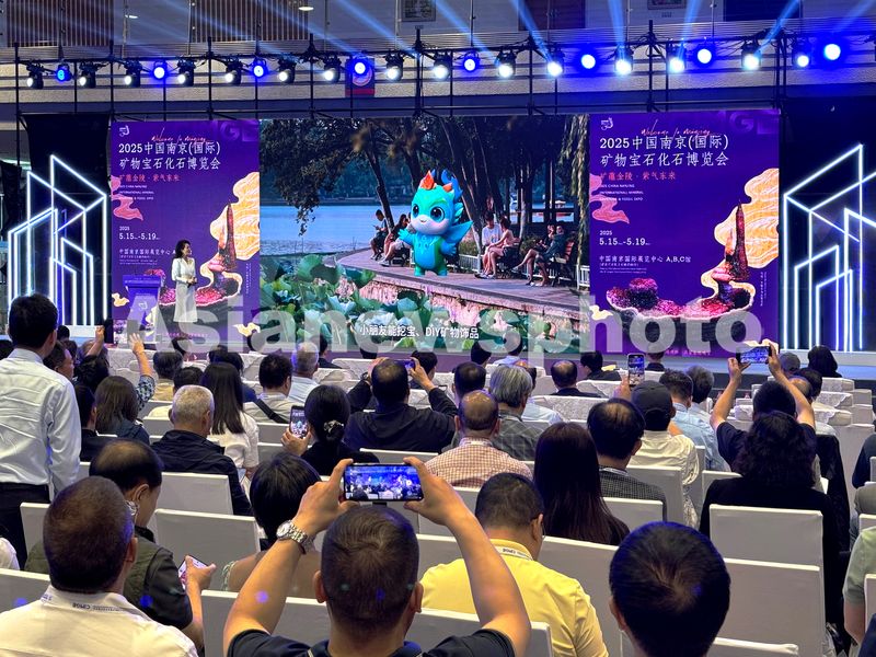 2025年5月15日,中国南京(国际)矿物宝石化石博览会开幕式现场,矿博会数字吉祥物晶灵与观众互动介绍城市和展会。