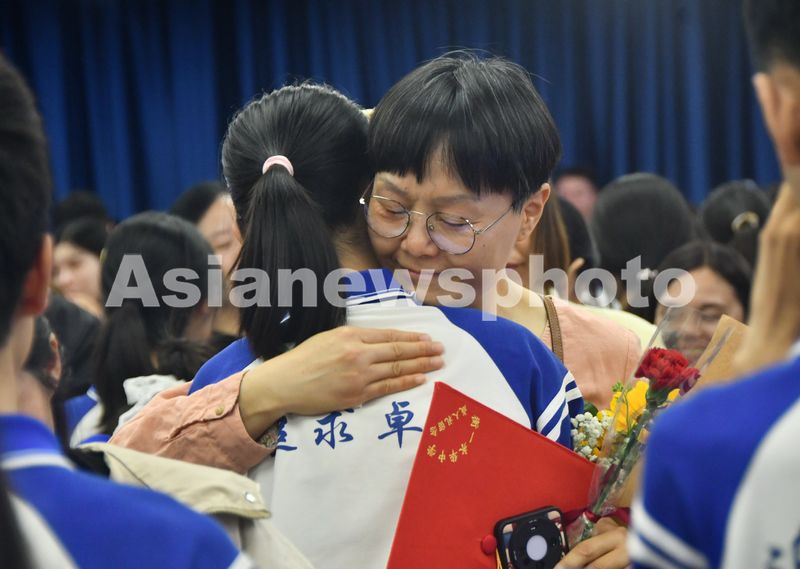 图片说明:2025年5月18日,在河北省邯郸市永年区的衡一永华中学成人礼活动上,学生与家长相互拥抱。